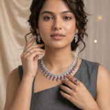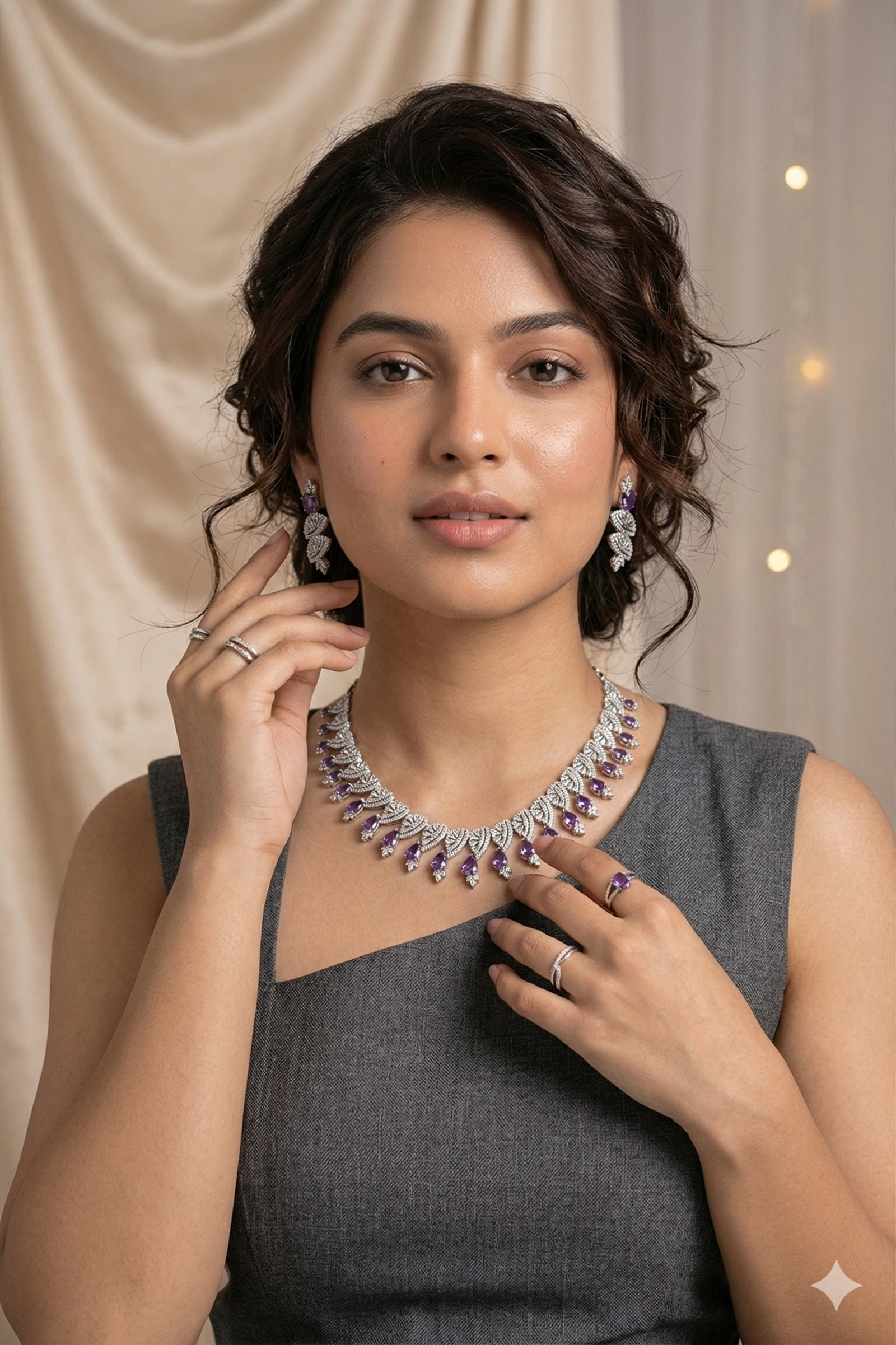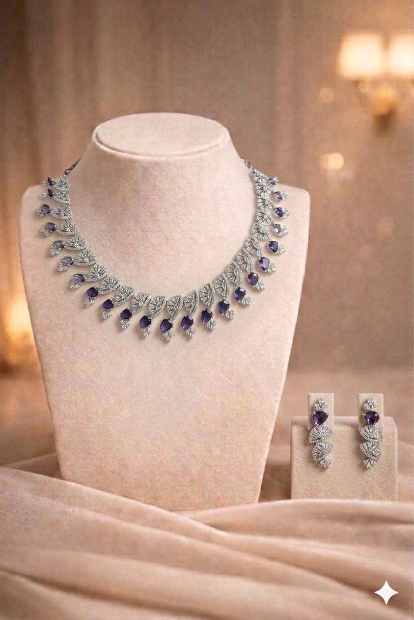 Let’s be honest—this set has “Dean’s List” written all over it. The ‘Gatekeeper’ is for the girl who is successfully balancing a 9.0 CGPA, a side hustle, and a perfectly curated Pinterest board. Those deep amethyst-purple stones are giving royal, intellectual energy, while the sharp, fan-like silver detailing adds a layer of “don’t waste my time” sophistication.