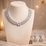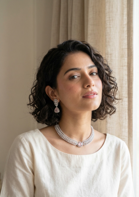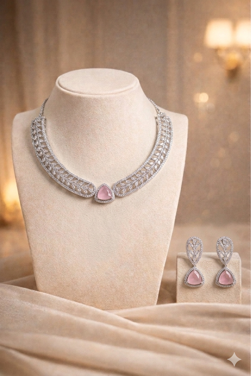 A garden carved in silver. This set features a triangular, soft-pink stone that looks like a captured morning dewdrop on a rose petal. The choker is designed with a breathable, lace-like floral pattern that sits perfectly against the skin.