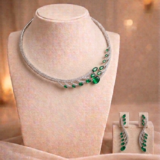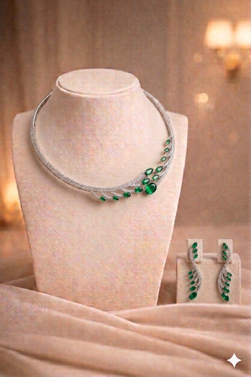 The Hariyali-Vibe is for the girl who is deeply grounded but lives for a high-fashion aesthetic. Featuring a fluid, silver branch design that seems to bloom with vibrant green emeralds, this set captures a sense of growth and organic renewal. It sits gracefully against the skin, offering a look that is both rooted and contemporary. Perfect for the Gen Z woman who values a “Clean Girl” aesthetic, this set brings a fresh, nature-inspired energy to traditional Indian craftsmanship, making it the ultimate piece for a sun-drenched garden wedding or a sophisticated brunch.