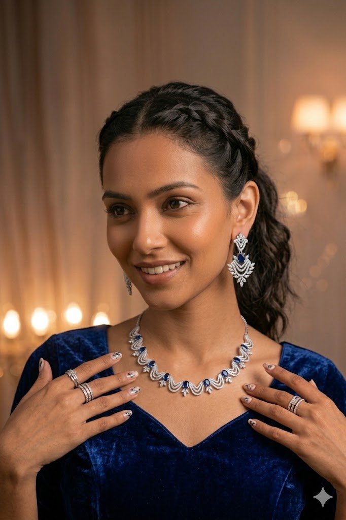 Tailored for the “Shy yet Sophisticated” archetype, the Neel-Vibe collection is all about that “Quiet Luxury” flex. The intricate detailing on the earrings and the matching rings adds a rhythmic sparkle to every gesture, making it perfect for your next “GRWM” video or a grand family function. It captures that specific Gen Z duality—being a little bit “Rebel” and a whole lot of “Grace.” This is the set you wear when you want to honor your heritage while totally slaying the present.