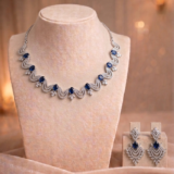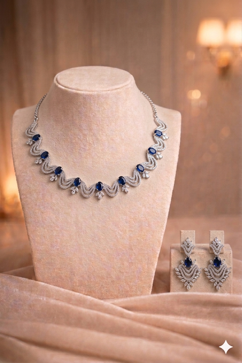 The Neel-Noor set is for the girl who is deeply rooted but lives for the aesthetic. It’s giving “Modern Maharani” meets “South Asian Pinterest.” Featuring royal blue stones that hit like a midnight dream, the silver-toned waves wrap around your neck with a fluid, effortless grace. This isn’t just jewelry; it’s a whole mood. Whether you’re pairing it with a heavy velvet lehenga or a chic silk corset, this set is designed to be the “Main Character” of your look.