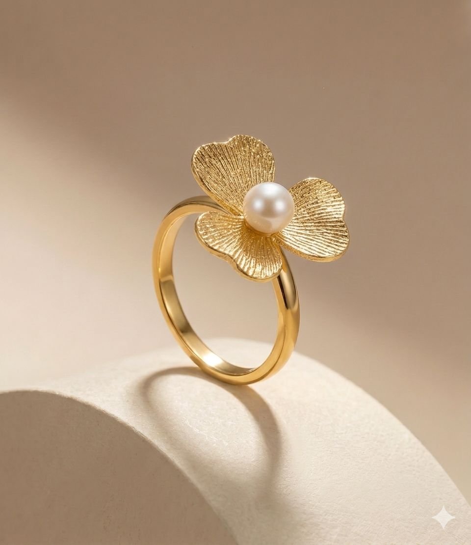 A delicate floral ring with a radiant pearl centerpiece, designed to add elegance to your everyday style.