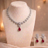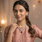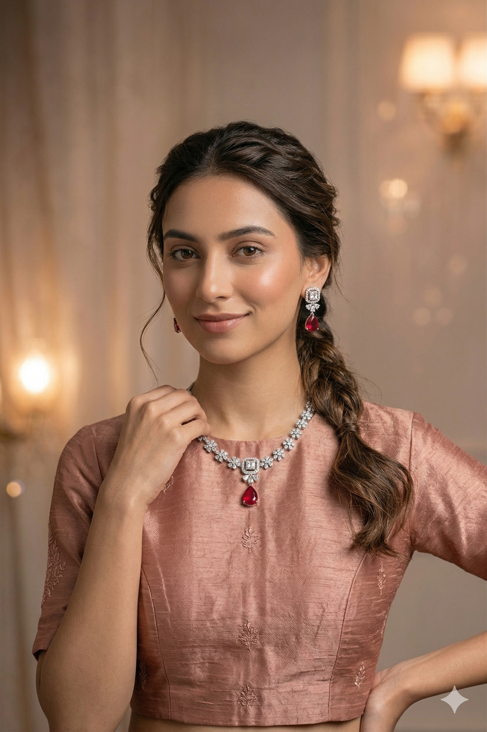 The craftsmanship is honestly elite—the way the floral diamond-like patterns lead your eye straight to that intense ruby drop is pure chaos in the best way possible. It’s for those nights when you’re heading out to a rooftop party in Indiranagar or Bandra, wearing a sleek black corset or a pre-draped saree that you definitely didn’t tie yourself. It says, “I’m here to break hearts and take names, but I’ll look like royalty while doing it.” If you’re looking to enter your villain era with class, this is your starter pack. Dangerous? Maybe. Iconic? Absolutely. 🥀✨