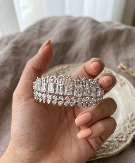 Get ready to serve pure royalty with this absolute stunner of a bracelet! This piece isn’t just an accessory; it’s a whole mood, featuring a triple-threat design that combines massive emerald-cut crystals with a delicate pear-drop fringe for that extra “main character” energy. The top layer is finished with dainty, diamond-encrusted loops that give it a modern crown-like vibe, all set in a high-shine silver finish that literally glows. Whether you’re heading to a big-fat-wedding or just want to flex on the gram, this chunky, high-glam kada is the ultimate vibe-check passed. 💎🔥