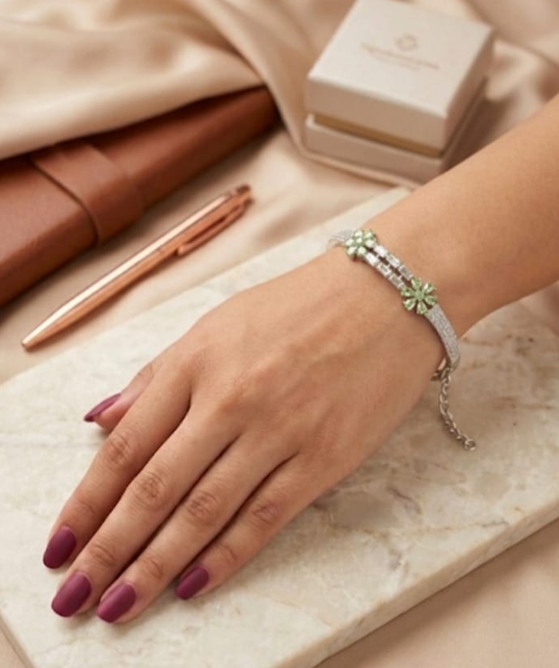 This piece radiates fresh, spring-inspired elegance with a high-glam twist. It features two delicate, light-green floral motifs sparkling with peridot-hued stones. These beautiful blossoms are connected by a shimmering double band of pavé crystals, making it the perfect delicate accessory to add a soft pop of pastel color to your everyday or evening look.