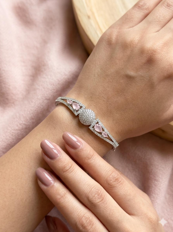 Get ready to dazzle with this ultra-modern, geometric flex! This kada features a unique pavé-encrusted “disco ball” center that catches every bit of light, paired with dreamy, blush-pink pear stones that add that perfect soft-girl touch. The split-band design gives it a sleek, futuristic silhouette that’s totally on-trend. Whether you’re hititng up a party or just elevating your “clean girl” look, this silver-finish stunner is the ultimate accessory for that high-glam, main character energy. 💎✨